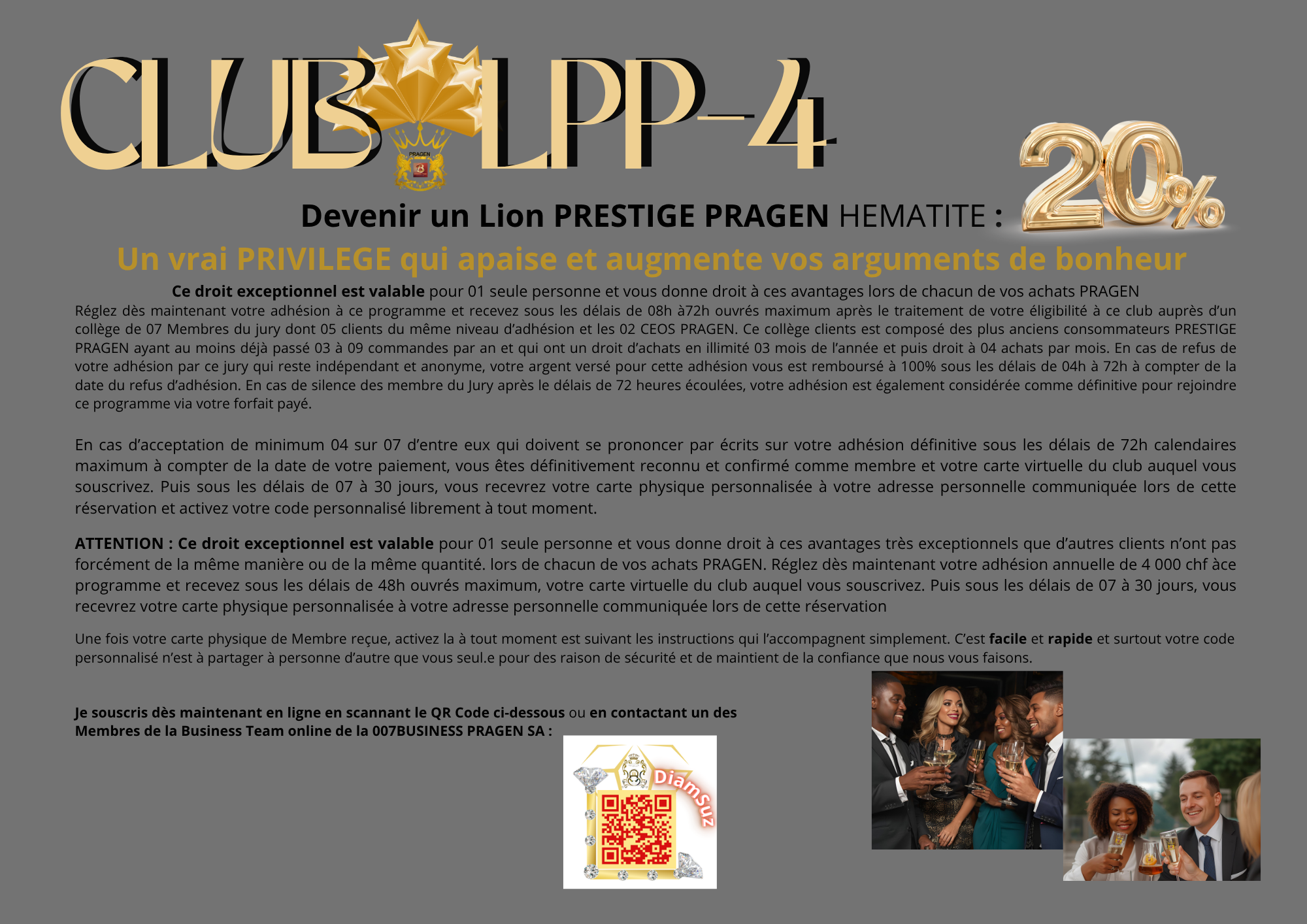 Réglez dès maintenant votre adhésion à ce programme et recevez sous les délais de 08h à72h ouvrés maximum après le traitement de votre éligibilité à ce club auprès d’un collège de 07 Membres du jury dont 05 clients du même niveau d’adhésion et les 02 CEOS PRAGEN. Ce collège clients est composé des plus anciens consommateurs PRESTIGE PRAGEN ayant au moins déjà passé 03 à 09 commandes par an et qui ont un droit d’achats en illimité 03 mois de l’année et puis droit à 04 achats par mois. En cas de refus de votre adhésion par ce jury qui reste indépendant et anonyme, votre argent versé pour cette adhésion vous est remboursé à 100% sous les délais de 04h à 72h à compter de la date du refus d’adhésion. En cas de silence des membre du Jury après le délais de 72 heures écoulées, votre adhésion est également considérée comme définitive pour rejoindre ce programme via votre forfait payé.